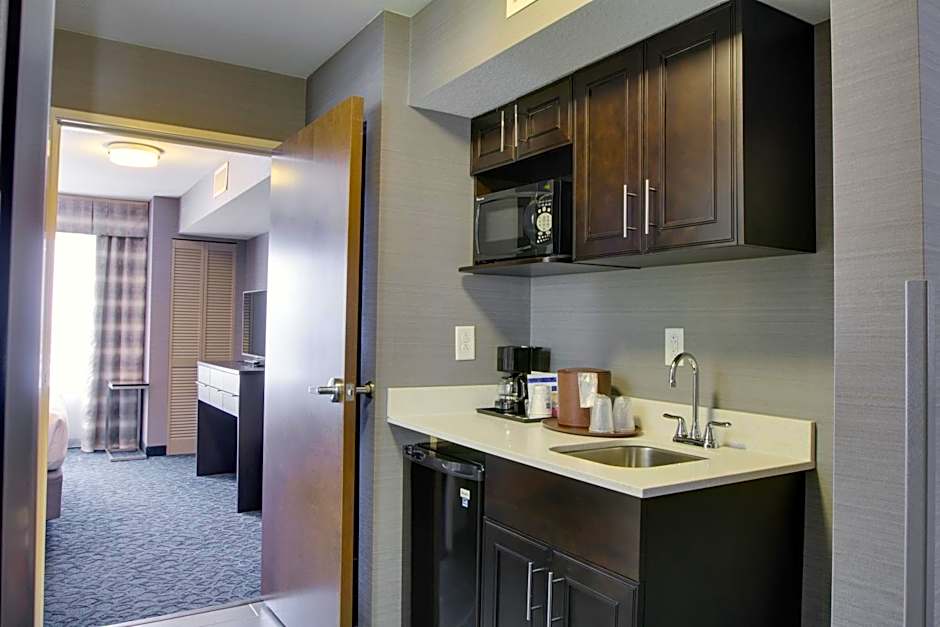 This suite has a seating area with a sofa and a 42 inch flat-screen TV. A microwave, refrigerator, and coffee machine are also featured.