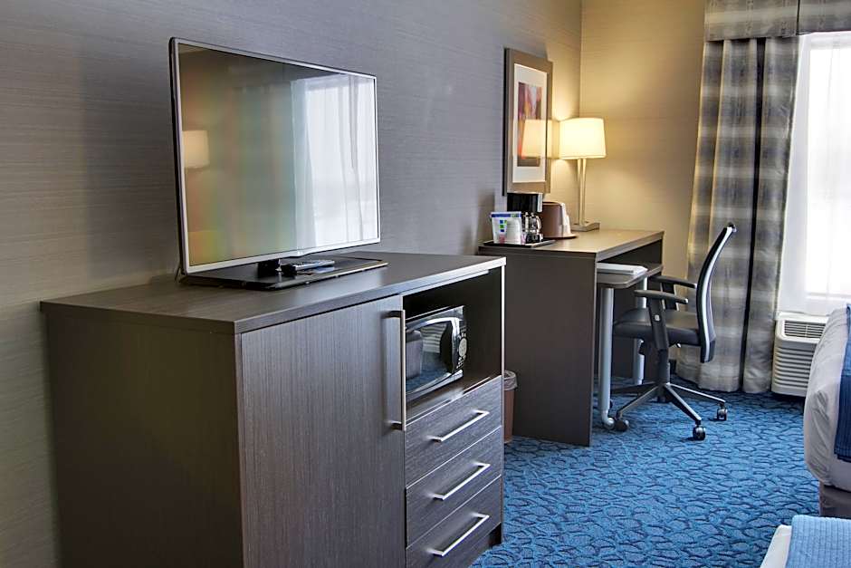 This suite has a seating area with a sofa and a 42 inch flat-screen TV. A microwave, refrigerator, and coffee machine are also featured.